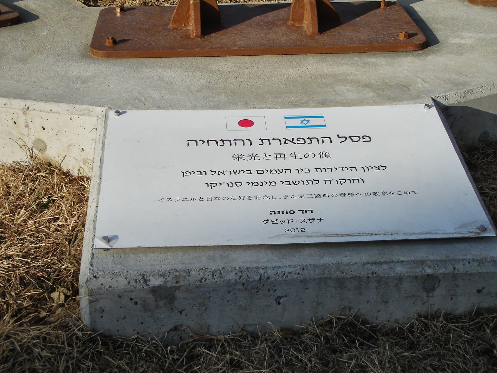 「ここは吾がテリトリー」、犬がおしっこでマーキングするのに似ていて、確かにとてもわかりやすいのです。わたしは考えます。南三陸町ではなく東京だったなら、この「彫刻」はつくられただろうかと... 設置に反対する運動が組織されはしなかったろうかと... 単純といっていいほど透けて見える意図に「彫刻」と看做されたろうかと... 南三陸町は踏んだり蹴ったりと考えているに違いありません。震災の混乱の中で、宮城県栗原市の佐藤勇市長から、イスラエル軍の医療団受け入れを打診され受け入れたばかりに、イスラエル軍医療団が設置した、いえ、イスラエル大使館によればプレハブは栗原市の佐藤勇市長に依頼したということのようですが、本来なら医療団派遣国の責任でなされるべきこと、それが賃借料を支払わなければならないと知らされることもなく、イスラエル軍医療団が引き上げたあと、そのまま診療所として使用できることに感謝まで表明していたのですから。2011年6月21日のこの記事、『支援のプレハブ「まさか」の請求 南三陸町に賃借料2000万円計上』が、南三陸町の驚きを報じています。おまけに「彫刻」というよりむしろ「日本を取り込んだと宣言するイスラエル旗」といったところでしょうか、この構造物の管理費まで拠出していかなければないのです。